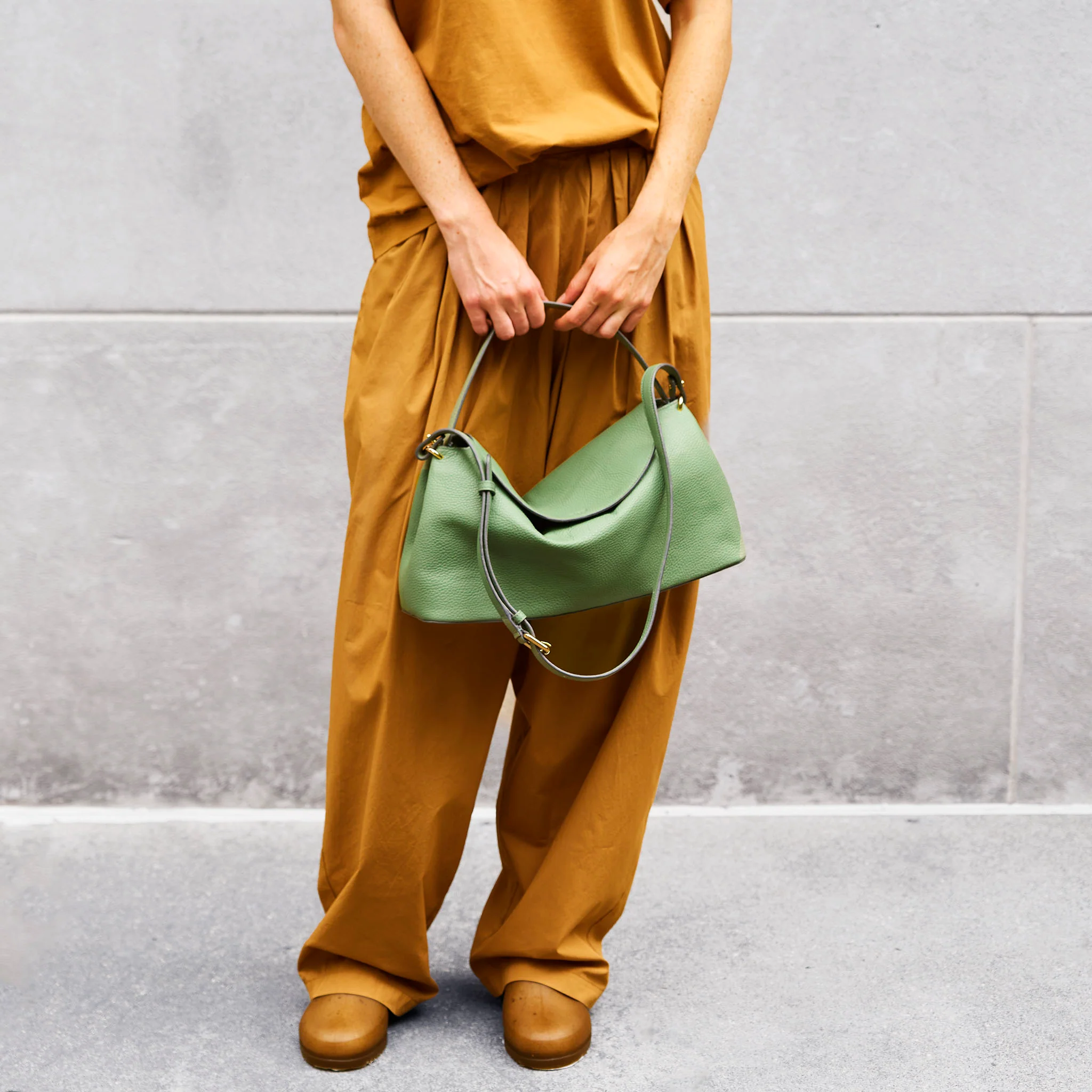 Where soft structure meets effortless style. The Ani Satchel is crafted from supple, pebbled Italian leather that feels as luxurious as it looks. Its clean, minimalist silhouette is designed for the everyday—lightweight, roomy, and endlessly versatile. A gently curved flap closure keeps the look sleek and understated, while the spacious interior makes it easy to carry your essentials. The top handle and removable shoulder strap let you wear it your way—handheld for a polished look or crossbody for a more relaxed feel. Subtle gold-tone hardware and hand-painted edges complete this timeless satchel, making it a standout piece that works from day to night.