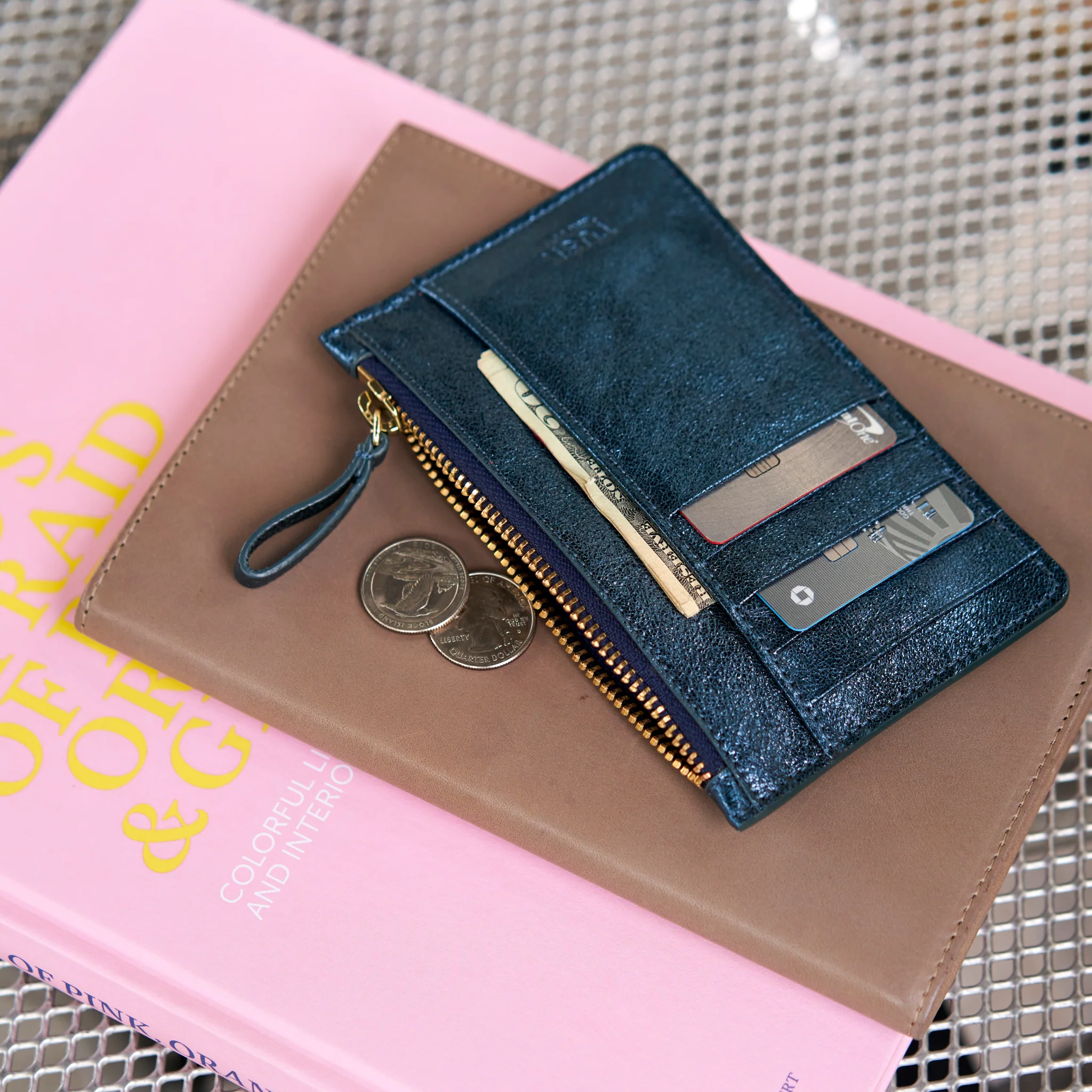 Toss it into your bag or run out with it to pick up your favorite chai or latte; the sleek and compact top zip card case is ideal. With 5 card slots on one side, and an open pocket, plus a zipper pocket in which to stash folded bills, this card case is a winner.