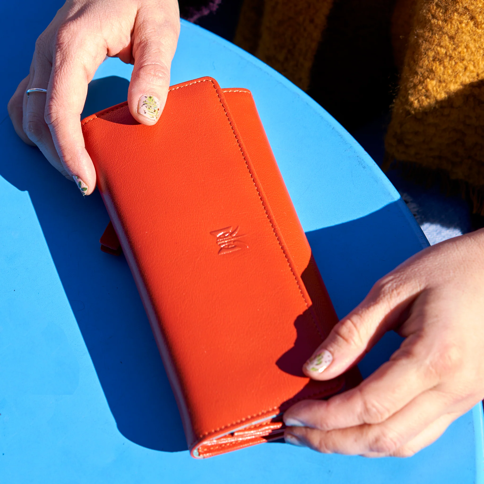 The Accordion Clutch design wins out with ease for increased visibility and functionality. It has a back zipper pocket a fold-over design that opens to reveal 3 separate compartments with 12 card slots, zip pocket, and room for papers, pens, or lip gloss.
